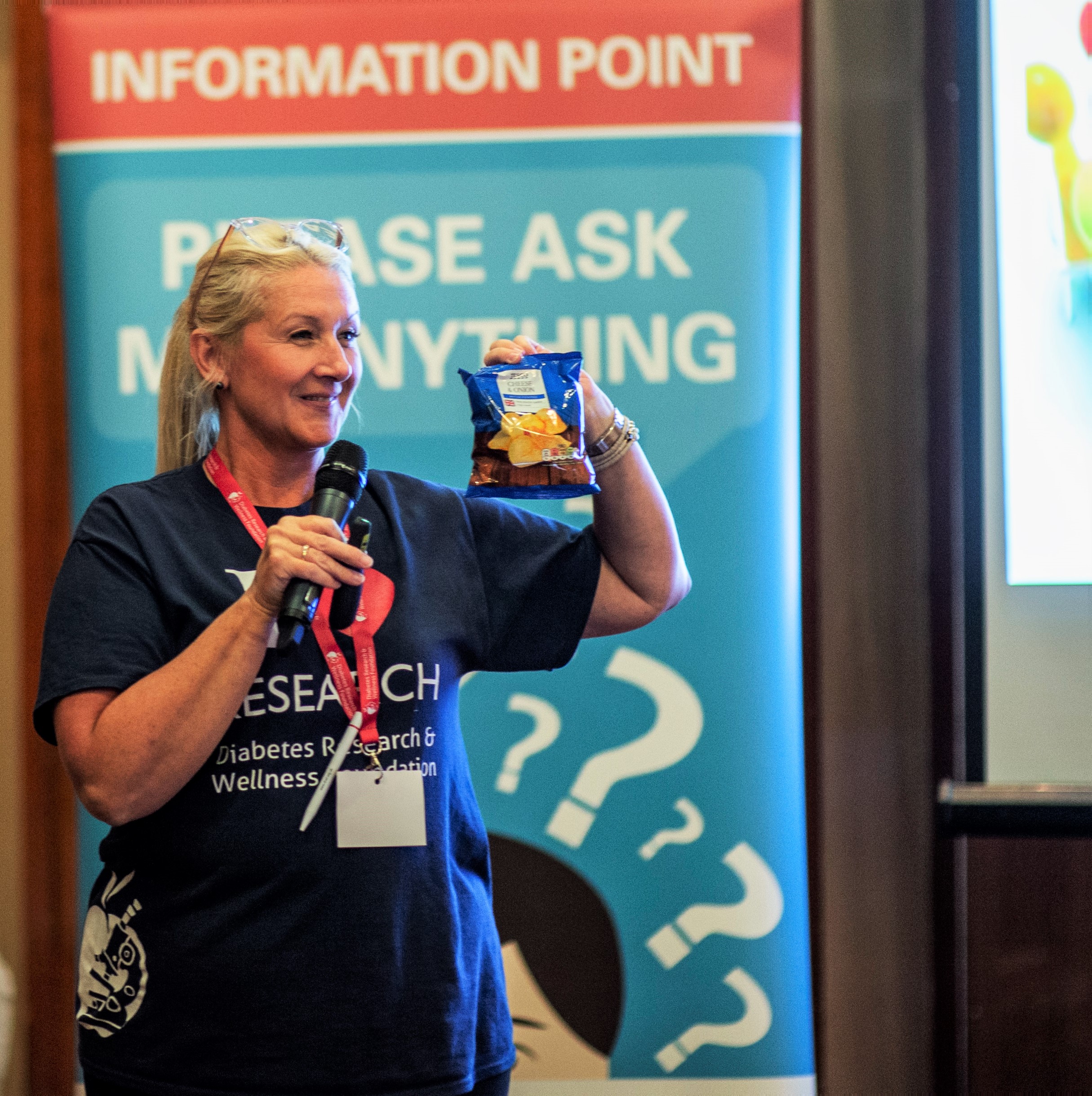 One final break for refreshments and a last chance to visit the exhibitors was followed by the most asked about topic, ‘Diabetes and diet for good health,’ which was delivered by DRWF friend, volunteer and Specialist Dietitian and Nutritionist, Lisa Poole. Lisa explored the different food groups and their relationship with diabetes management, the role of carbohydrates and their effect on blood-glucose levels and some of the current recommended management programmes such as the NHS Diabetes Prevention Programme for type 2 diabetes and weight loss programmes, including the soups and shakes diet and others. We handed out different size portions of food items to get the attendees brains working to guess the carb contents.