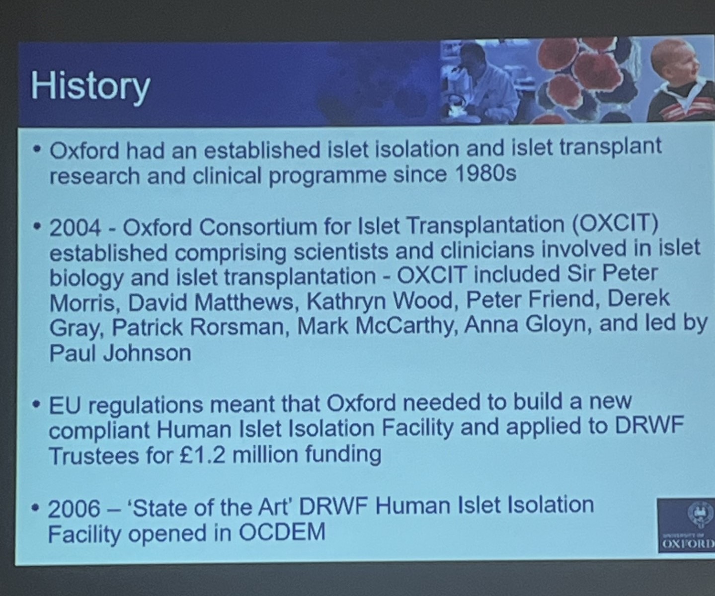 På Oxford University i Storbritannien arbetar bland annat Rebecca Spiers och Paul Johnson, som bland annat sitter i vår rådgivande kommitté, i ett gemensamt forskningsprojekt gällande transplantation av Langerhanska öar. ”Vår forskargrupp undersöker för närvarande strategier för att anta en enzymdoseringsmetod som tar hänsyn till den mänskliga bukspottkörtelns molekylära struktur”, berättar Rebecca.