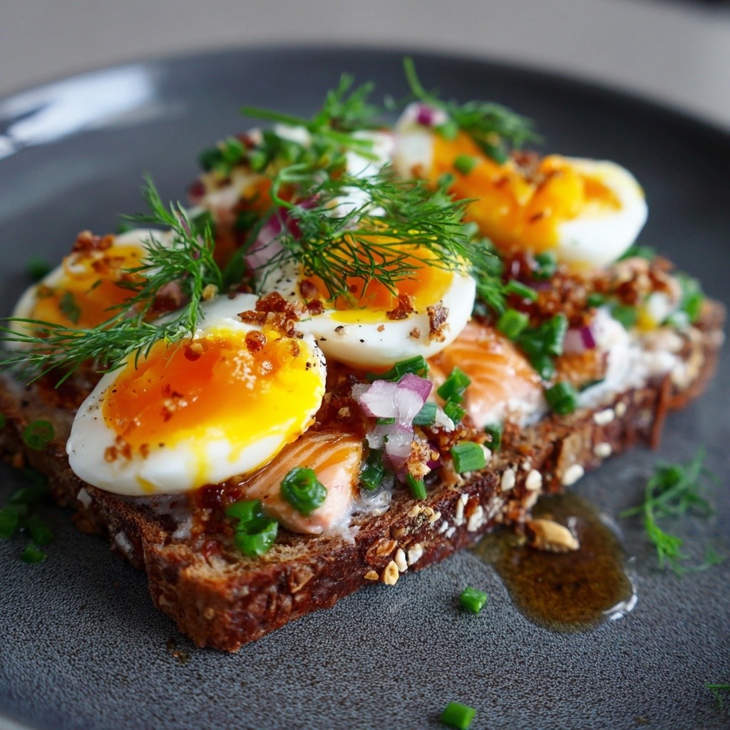 - Montering: Lägg en skiva bröd på varje tallrik. Toppa med äggskivor, sillbitar, rödlök och ringla över det brynta smöret.