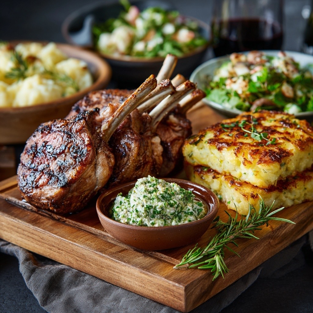 Grillade lammracks med ramslökspesto, rödvinssås och potatiskaka (6 portioner)