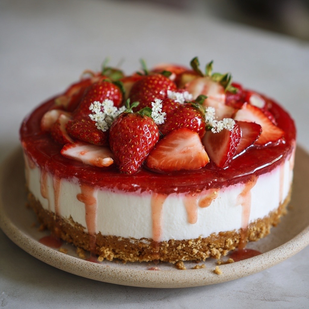 Jorgubbscheesecake med fläderblommor & jordgubbscoulis