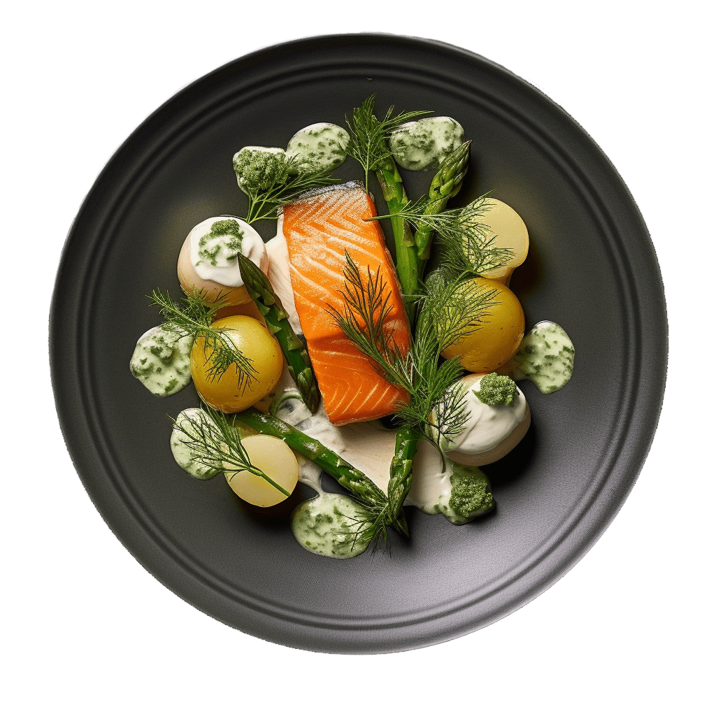 Kallrök lax med grön sparris, citronkräm och färskpotatis