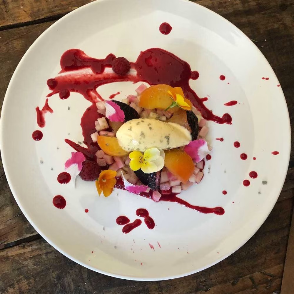 Lägg hallonkräm centralt på tallriken och ”splasha” den med en slev. Lägg upp rabarber och grillade plommon sporadiskt på tallriken, toppa med ett ”ägg” plommonglass, strö över lakritssnön.