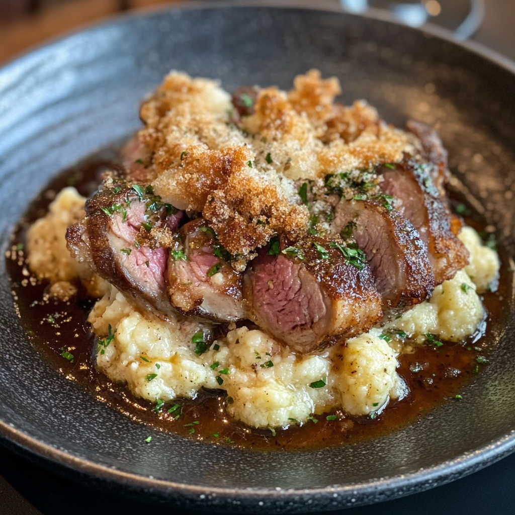 Lammstek med rosmarin & vitlök, blomkålsgratäng, haricots verts & rödvinssky